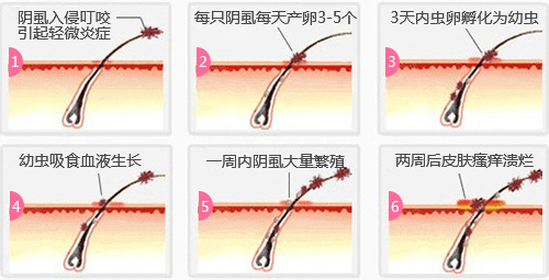 阴虱为不完全变态发育,其生活史分为:卵、若虫和成虫三个阶段。如果已经看到阴虱成虫或虫卵,说明感染该病已经有1~2周的时间,一定要立即到院诊治。